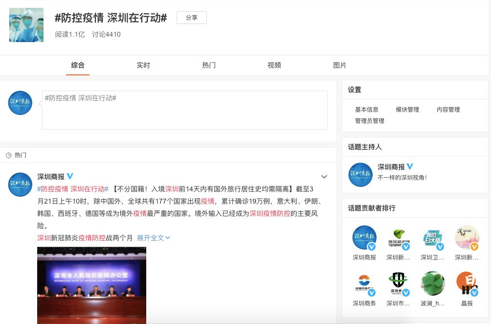疫情發(fā)生初期,深圳商報微博創(chuàng)建話題 #防控疫情 深圳在行動# ,以高度的責(zé)任感和使命感全方位加強(qiáng)宣傳報道和輿論引導(dǎo),疫情相關(guān)信息均帶話題發(fā)布,人們可以系統(tǒng)地查看疫情相關(guān)信息。