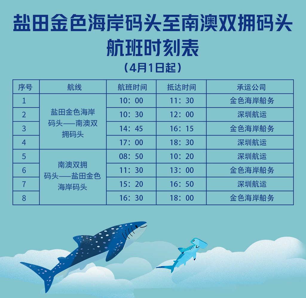 據(jù)了解,“鹽田-南澳”海上交通往返航線自3月12日正式復(fù)航,每天共4班。深圳航運(yùn)集團(tuán)增開后,該航線航班數(shù)量將恢復(fù)至疫情前的水平,達(dá)到每天8班。其中,由鹽田金色海岸碼頭至南澳雙擁碼頭新增航班時間為:10時30分和17時;由南澳雙擁碼頭至鹽田金色海岸碼頭新增航班時間為8時50分和15時20分。廣大市民及旅客朋友可通過深圳航運(yùn)旗下公眾號“鵬星會”查詢航班信息及訂票,單程成人票60元/人。