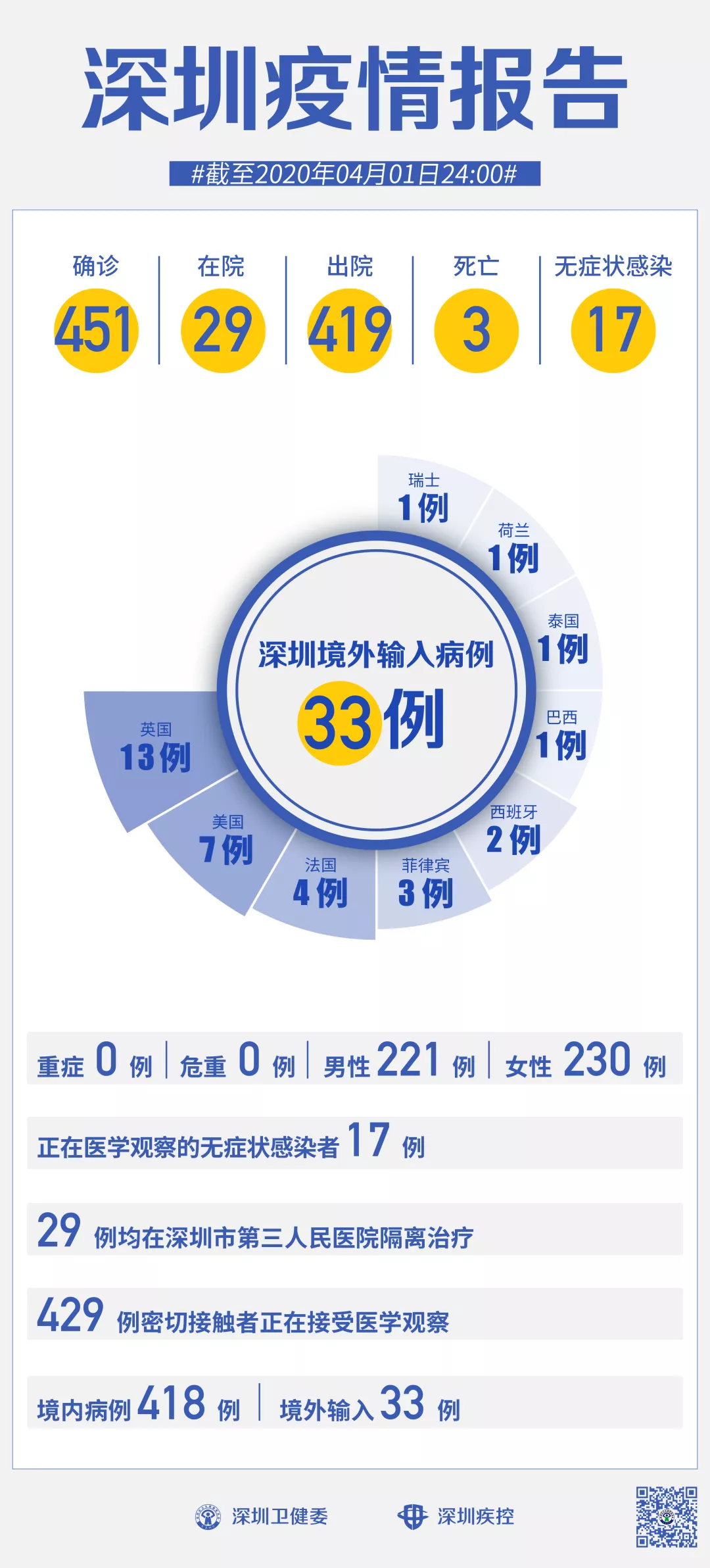 截至4月1日24時,深圳累計報告新冠肺炎病例451例。4月1日當天新增無癥狀感染者2例,出院2例。