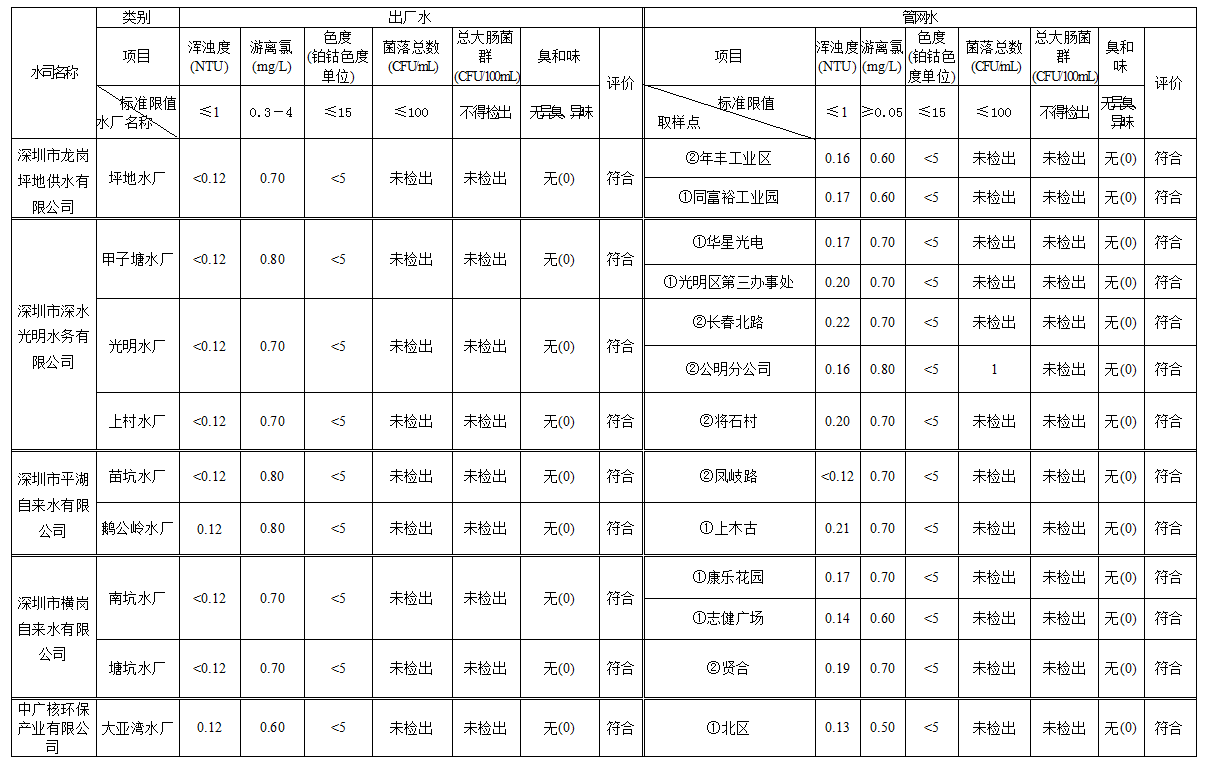 見(jiàn)圳客戶端·深圳新聞網(wǎng)2020年4月4日訊(見(jiàn)圳客戶端、深圳新聞網(wǎng)記者葉梅)2020年2月,深圳市水務(wù)局對(duì)全市42個(gè)水廠出廠水水樣以及68個(gè)管網(wǎng)水水樣進(jìn)行了抽檢。檢測(cè)結(jié)果表明,依據(jù)GB5749—2006《生活飲用水衛(wèi)生標(biāo)準(zhǔn)》,所有受檢42個(gè)出廠水水樣和68個(gè)管網(wǎng)水水樣的渾濁度、消毒劑(游離氯或二氧化氯或總氯)、色度、菌落總數(shù)、總大腸菌群及臭和味共6項(xiàng)常規(guī)指標(biāo)全部符合該標(biāo)準(zhǔn)的規(guī)定,出廠水水樣合格率為100%,管網(wǎng)水合格率為100%。