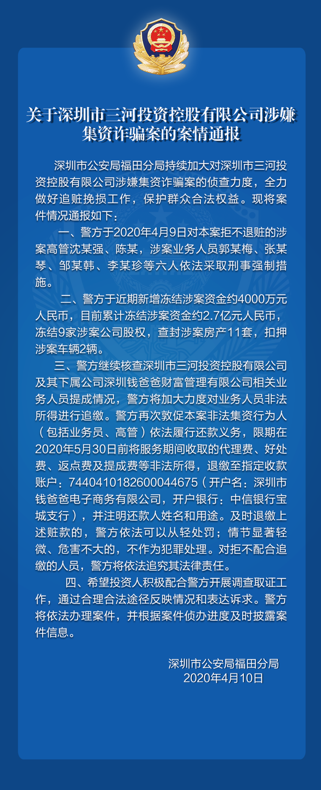 關(guān)于深圳前海東亞基金管理有限公司涉嫌非法吸收公眾存款、深圳市三河投資控股有限公司涉嫌集資詐騙的案件情況通報