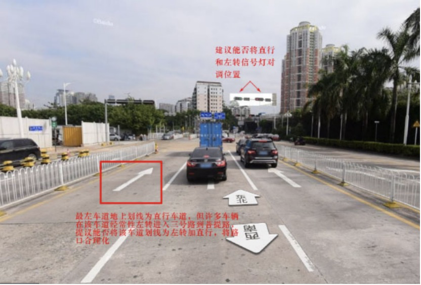市民建議,桂花路與三號路交叉路口的直行信號燈和左轉信號燈對調位置;同時,桂花路此處的直行最左側車道可改為左轉加直行標識。這樣既可以方便社會車輛在此左轉,又避免有些駕駛員因為沒注意到左轉信號燈而隨直行車輛左轉造成的堵塞或交通事故。