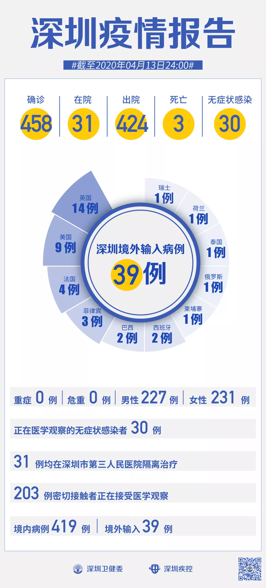 截至4月13日24時,深圳累計報告新冠肺炎病例458例。4月13日當天新增2例境外輸入病例,新增無癥狀感染者1例,出院1例。
