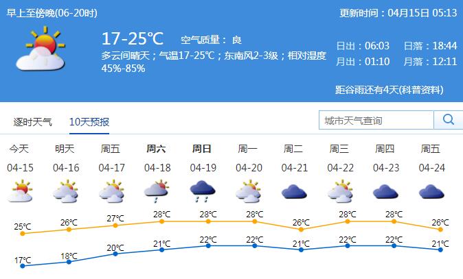 16-17日多云,氣溫繼續(xù)回升,中午前后較熱;18-19日有陣雨或雷雨。全市森林火險(xiǎn)黃色預(yù)警信號(hào)仍在生效中,需注意用火安全,防范火災(zāi)發(fā)生。