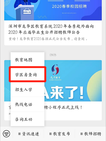 學(xué)區(qū)房鎖定情況可通過“龍華教育”微信公眾號—“資訊速遞”—“學(xué)區(qū)房查詢”自助查詢。查詢操作如下: