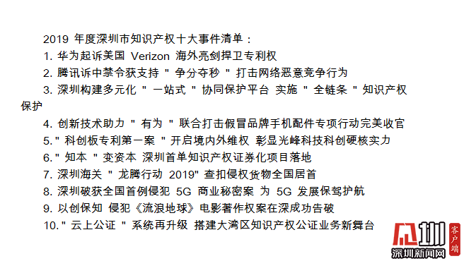 值得關(guān)注的是,在深圳市知識產(chǎn)權(quán)工作會議期間,全市2019年度知識產(chǎn)權(quán)十大事件正式對外發(fā)布,華為起訴美國Verizon、騰訊訴中禁令獲支持、“有為”聯(lián)合打擊假冒品牌手機(jī)配件專項(xiàng)行動完美收官等事件上榜。