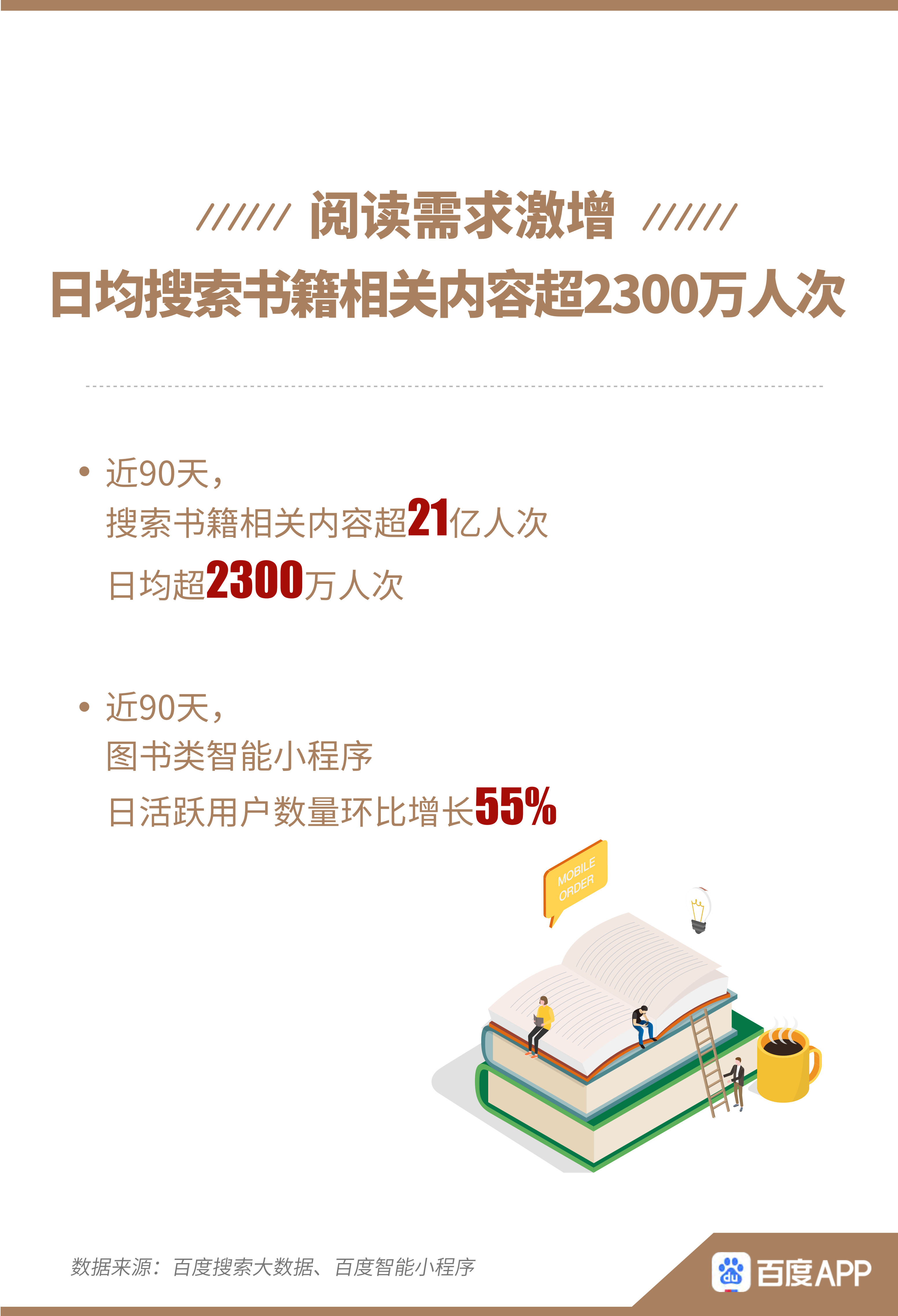 近日,百度APP聯(lián)合人民日?qǐng)?bào)數(shù)字傳播《有數(shù)青年》工作室發(fā)布的《百度全民讀書搜索大數(shù)據(jù)報(bào)告》(以下簡(jiǎn)稱“報(bào)告”)顯示,疫情宅家使網(wǎng)友閱讀需求激增,近90天,日均超2300萬(wàn)人次在百度搜索書籍相關(guān)內(nèi)容,累計(jì)超21億人次,圖書類智能小程序日活躍用戶環(huán)比增長(zhǎng)55%,讀書、購(gòu)書線上化再進(jìn)一步。