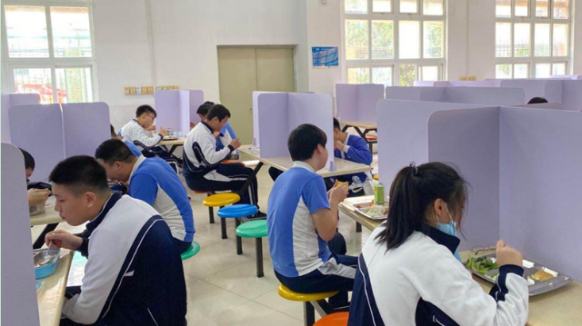 深圳特區(qū)報2020年4月27日訊 4月27日,深圳高三、初三學(xué)子返校。食堂是校園防控工作的重點(diǎn),中午時分,學(xué)生就餐開始,實(shí)行錯峰就餐、分區(qū)就餐。有的學(xué)校將每張餐桌用有機(jī)玻璃隔板分隔用餐區(qū)域,有的學(xué)校在空間足夠的條件下實(shí)行單人單桌,按號就座。