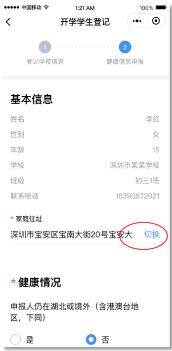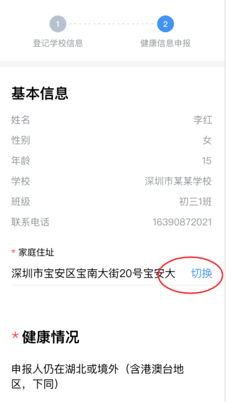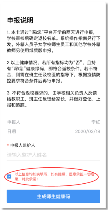 ⑤完成健康信息申報,包括選擇家庭住址、申報健康情況、填寫監(jiān)護(hù)人姓名等,請勾選申報承諾,點(diǎn)擊“生成師生健康碼”即可完成健康申報。