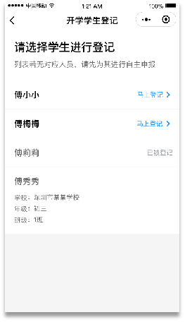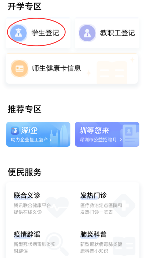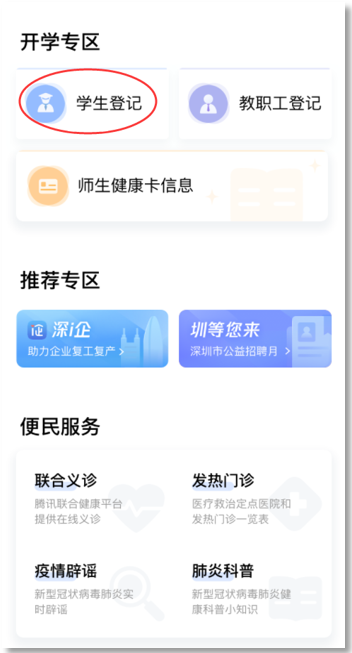 ①在首頁開學(xué)專區(qū),點(diǎn)擊“學(xué)生登記”進(jìn)入申報人員列表,進(jìn)行自主申報和實(shí)名認(rèn)證,再進(jìn)行開學(xué)登記。