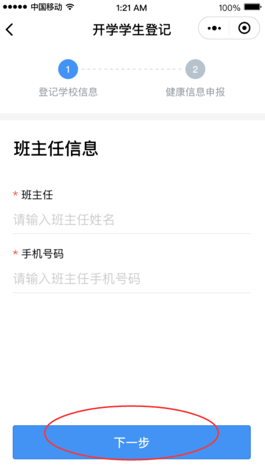 ②進(jìn)入“學(xué)生登記”頁面,點(diǎn)擊“馬上登記”按鈕,填寫班主任姓名和手機(jī)號碼后點(diǎn)擊“下一步”,然后選擇對應(yīng)的班級,進(jìn)入健康申報卡界面。