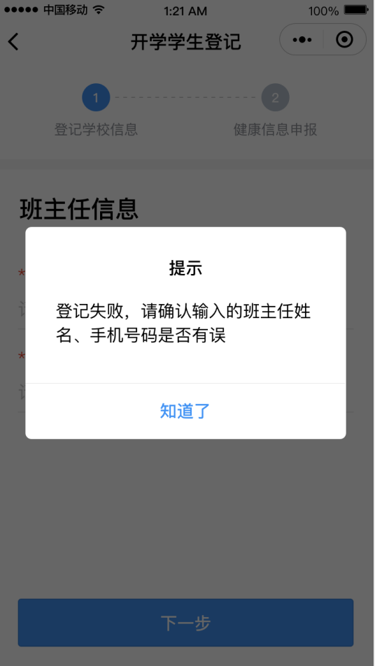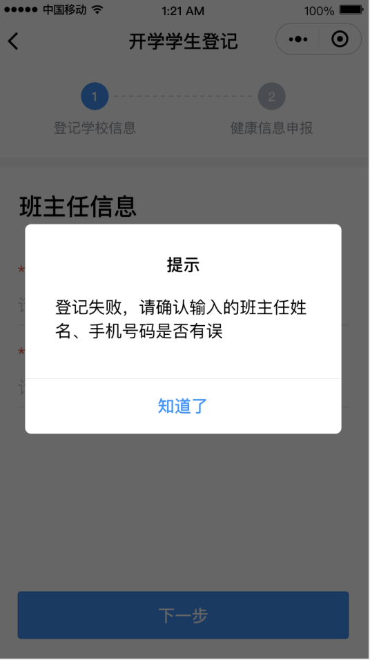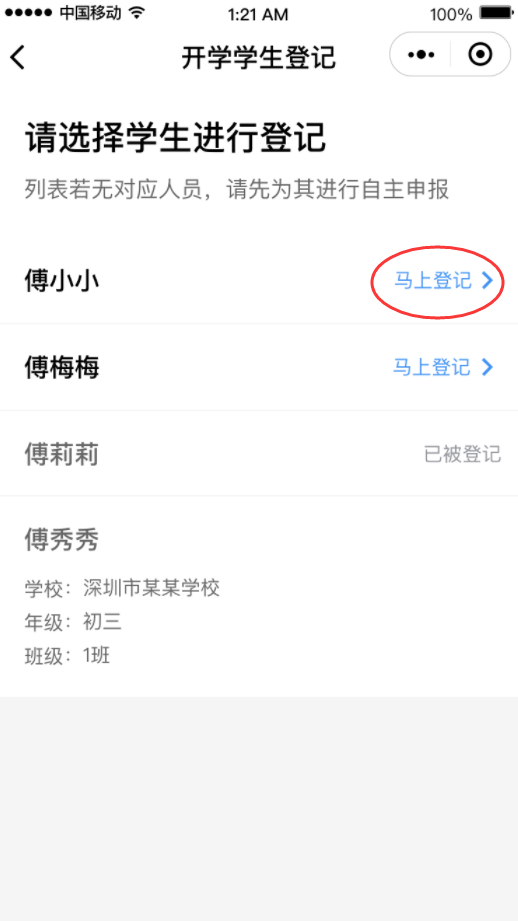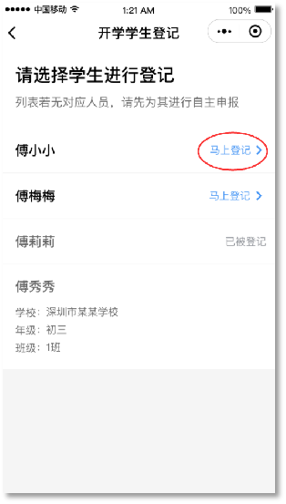 ③完成后進(jìn)入“開學(xué)學(xué)生登記”頁面,選擇學(xué)生名字旁邊的“馬上登記”,填寫班主任姓名和手機(jī)號碼后點(diǎn)擊“下一步”。