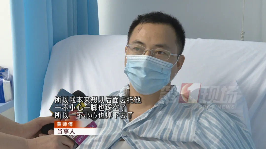 記者在病房見到了救人受傷的黃師傅。他說當(dāng)時(shí)一心只想著救人,忽略了做好安全措施。