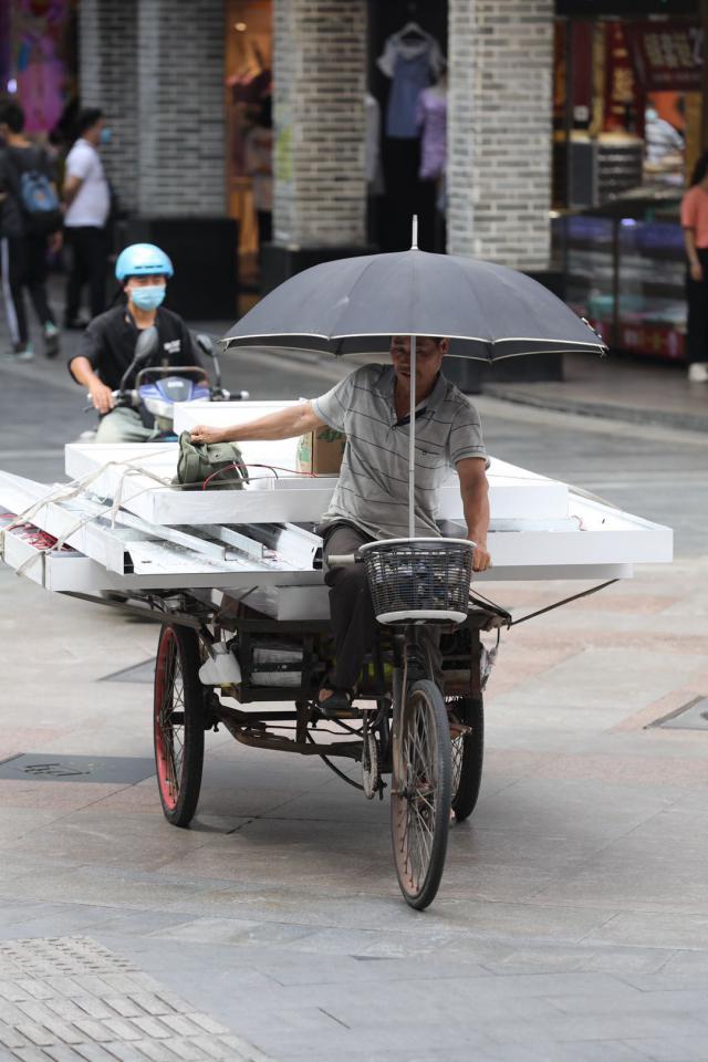 ▲走在街上,熱浪撲面而來,耀眼的陽光把人曬得睜不開眼,行人紛紛拿起手頭物品遮擋烈日。