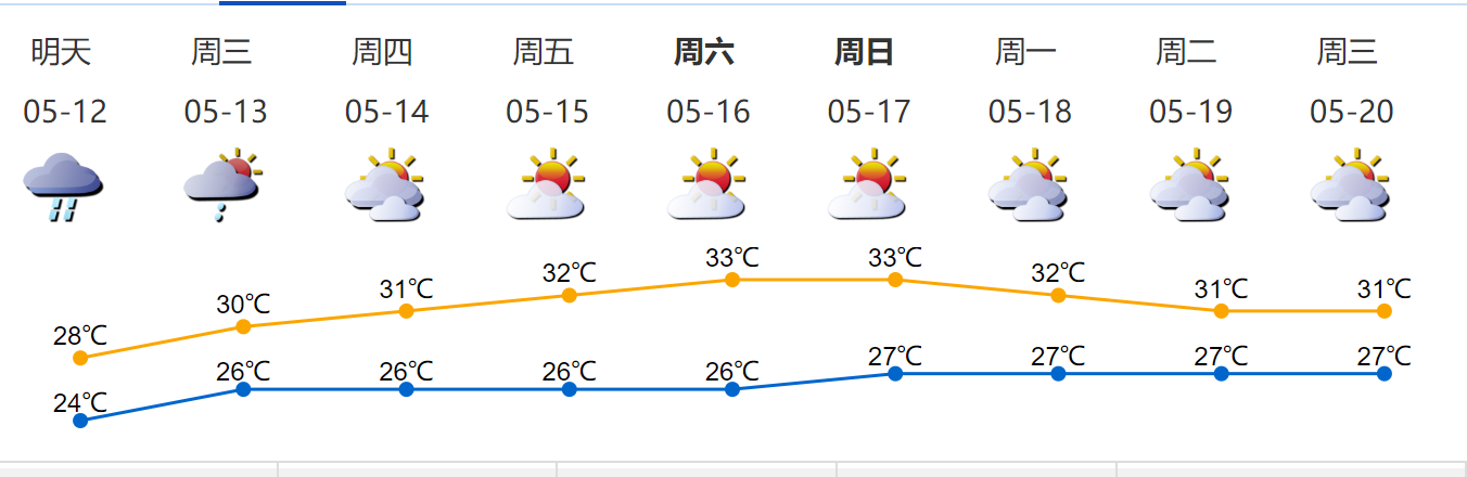 12日有雷陣雨,局部大雨,局部有短時陣雨;13日陣雨轉多云;14-17日多云到晴天,天氣再趨悶熱。