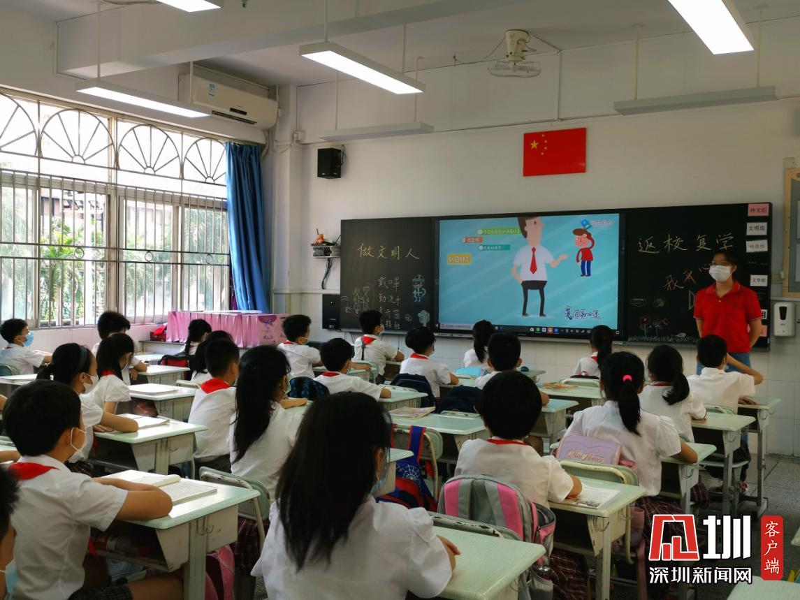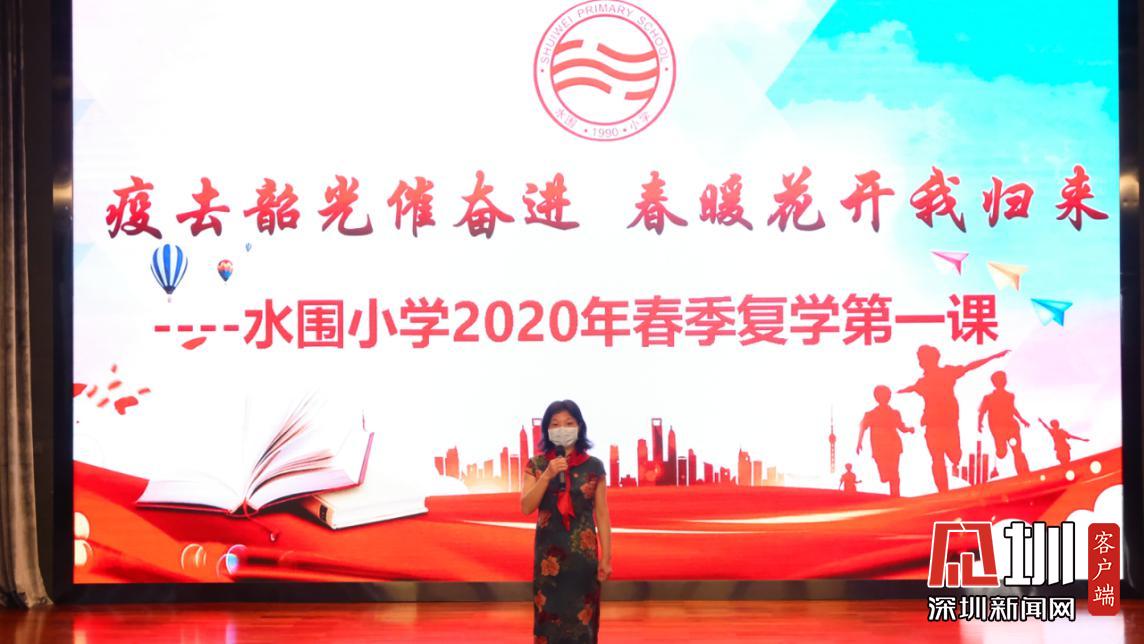 據(jù)悉,水圍小學(xué)“復(fù)學(xué)典禮”上午8:40正式開始,出席的嘉賓有福田區(qū)教科院教研員、少先隊(duì)總輔導(dǎo)員李楠、衛(wèi)生健康副校長明昭。各班級的學(xué)生則帶著口罩,單人單桌在教室內(nèi),以觀看直播的方式參加典禮。