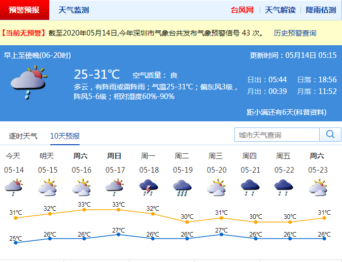 見(jiàn)圳客戶(hù)端·深圳新聞網(wǎng)2020年5月14日訊 還記得前兩天的強(qiáng)對(duì)流天氣嗎?目前仍是雷雨橫行的季節(jié),臺(tái)風(fēng)還需往后靠靠,臺(tái)風(fēng)未來(lái)兩天不會(huì)影響深圳。據(jù)市氣象臺(tái)消息,14日深圳以多云天氣為主,但仍有分散陣雨,大家外出記得帶傘,遮陽(yáng)又能遮雨。