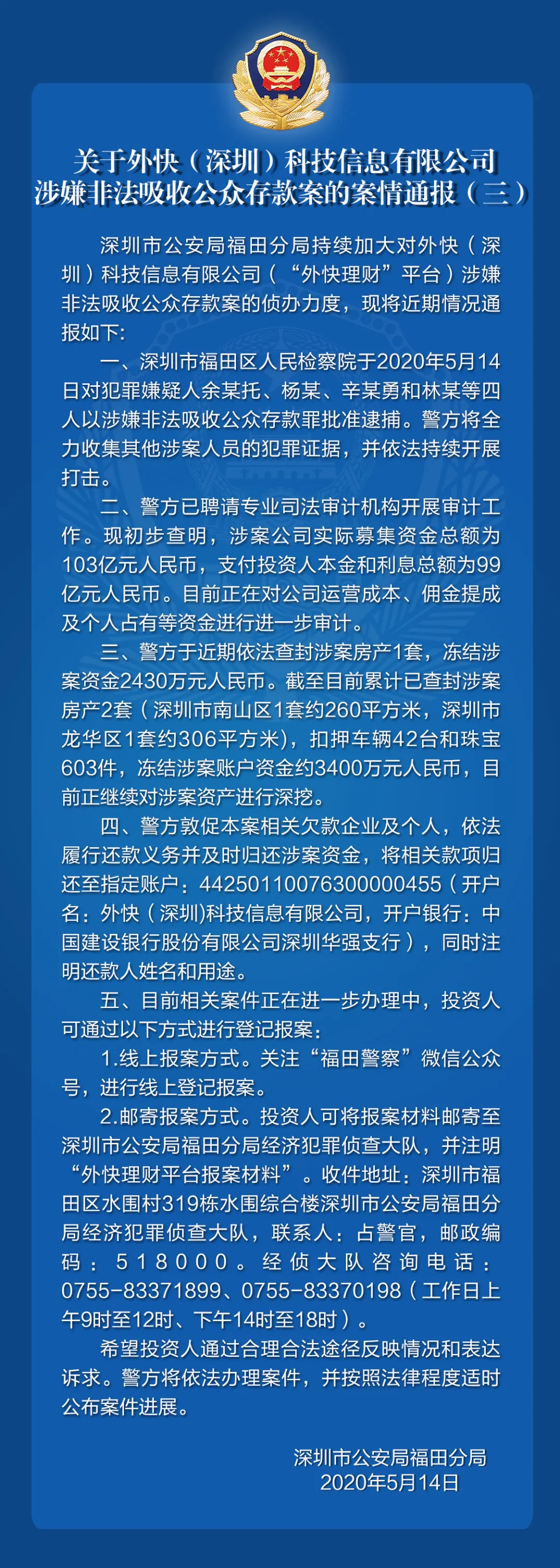 關(guān)于外快(深圳)科技信息有限公司涉嫌非法吸收公眾存款案的案情通報(bào)(三)
