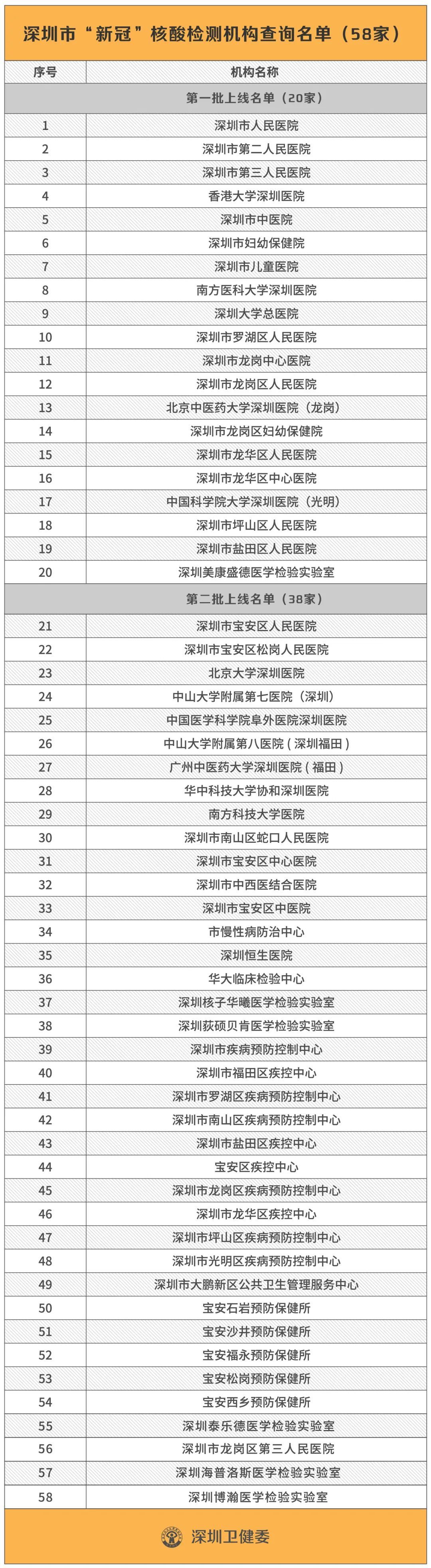 目前,深圳共有58家機(jī)構(gòu)開展新冠病毒核酸檢測(cè),包括35家醫(yī)院、16家公共衛(wèi)生機(jī)構(gòu)和7家第三方檢測(cè)機(jī)構(gòu)。