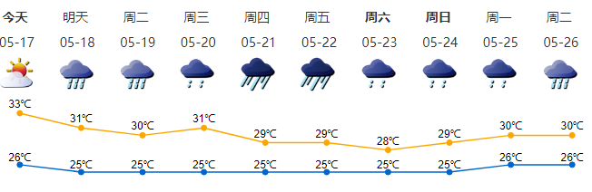 16日,粵北、粵東市縣多云間陰天,有分散的(雷)陣雨,其余市縣多云,局部有(雷)陣雨。全省大部最高氣溫介于33℃~36℃之間。