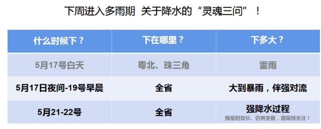 17日夜間到19日早晨,珠三角、粵東和陽江、茂名有大雨到暴雨,其余市縣有大雨局部暴雨;雷雨時(shí)伴有8級左右的短時(shí)大風(fēng)。