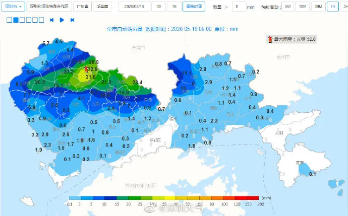 【深圳市分區(qū)暴雨黃色預(yù)警】預(yù)計(jì)福田區(qū),羅湖區(qū),南山區(qū),鹽田區(qū),大鵬新區(qū),西部海區(qū),東部海區(qū),寶安區(qū)(新安、西鄉(xiāng)、航城街道),龍崗區(qū)(南灣、坂田、園山、橫崗、布吉、吉華街道),龍華區(qū)(民治街道)和坪山區(qū)(馬巒、碧嶺街道)1-2小時內(nèi)將出現(xiàn)20-40毫米降水,深圳市氣象臺于2020年05月18日15時50分在上述地區(qū)發(fā)布暴雨黃色分區(qū)預(yù)警,全市進(jìn)入暴雨戒備狀態(tài),請注意防范。