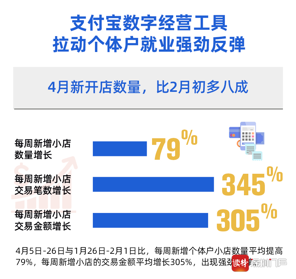 3月底以來全國各地掀起了一輪消費券高潮,截至目前已有170多個地市發(fā)放190多億元消費券,杭州、鄭州等城市的乘數(shù)效應(yīng)都在10倍以上。支付寶數(shù)據(jù)顯示,受益商戶中9成為個體戶小店,成為拉動小店經(jīng)營的有力的數(shù)字化工具。也正是4月以來,個體戶小店的每周新增數(shù)量、每周新增小店的交易流水增長實現(xiàn)了強勢反彈。