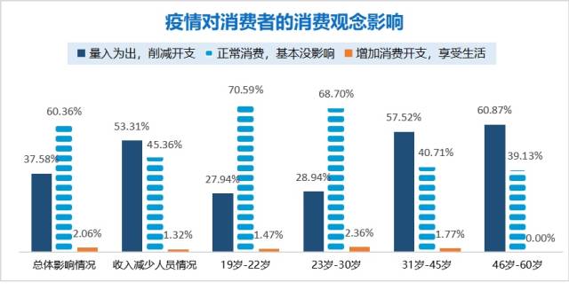 調(diào)研發(fā)現(xiàn),在疫情影響下,60.36%消費(fèi)者選擇正常消費(fèi),37.58%的消費(fèi)者選擇量入為出,削減開(kāi)支;而受疫情影響收入下降的受訪者中,大部分人選擇“削減開(kāi)支”,增加消費(fèi)支出的僅占2.06%。