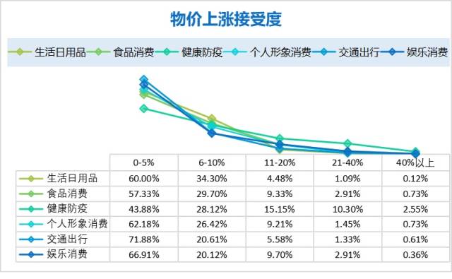 調(diào)研發(fā)現(xiàn),對(duì)于生活日用品、食品消費(fèi)、個(gè)人形象消費(fèi)、交通出行、娛樂(lè)消費(fèi)等各項(xiàng)消費(fèi),大部分消費(fèi)者能接受的價(jià)格上漲幅度在5%以?xún)?nèi)。而健康防疫物資方面,43.88%的消費(fèi)者接受5%以?xún)?nèi)的漲幅,28.12%的消費(fèi)者接受6-10%的漲幅,15.15%的消費(fèi)者接受11-20%的漲幅,即消費(fèi)者能接受防疫物資價(jià)格較大幅度的上漲。