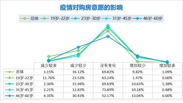 通過(guò)對(duì)不同年齡段消費(fèi)者的購(gòu)房、購(gòu)車(chē)意愿調(diào)研發(fā)現(xiàn),19-22歲及46-60歲的受訪者因疫情影響購(gòu)房、購(gòu)車(chē)意愿變化相對(duì)較大,意愿減少人數(shù)占比較多。