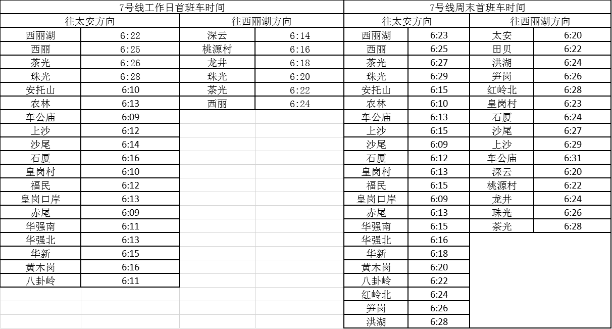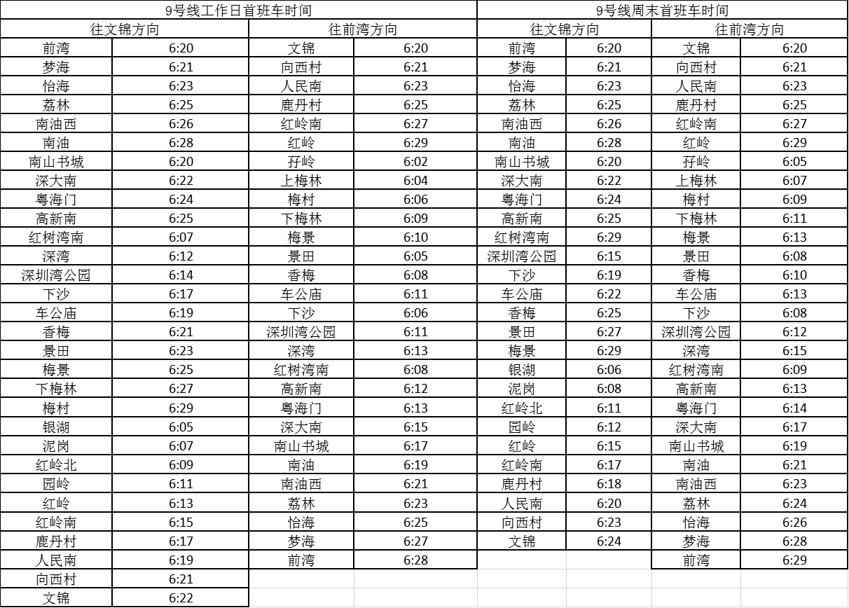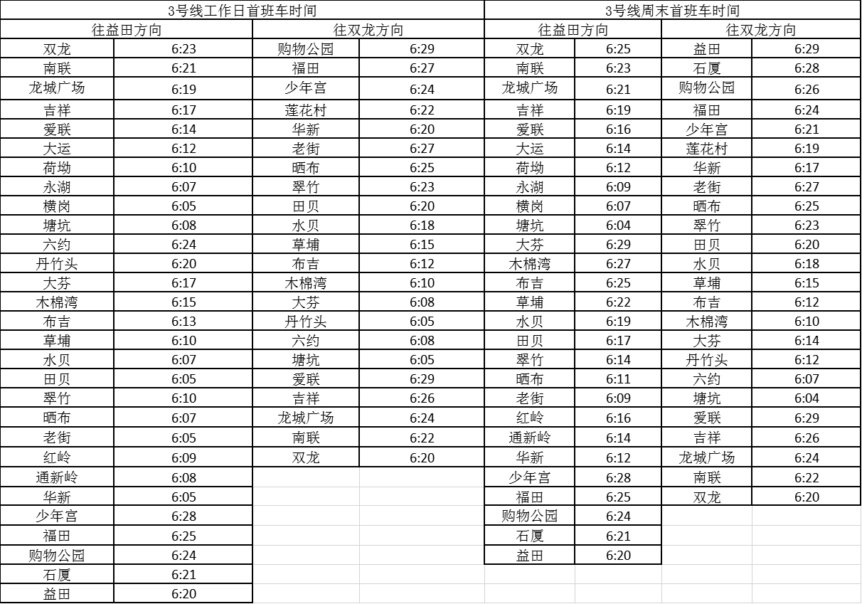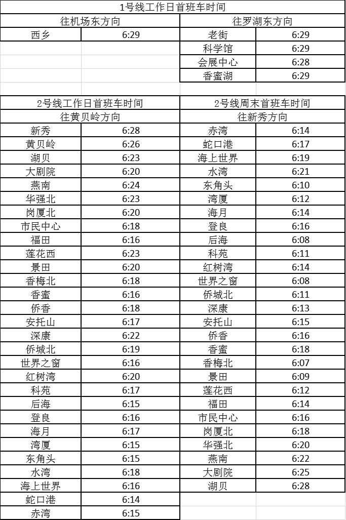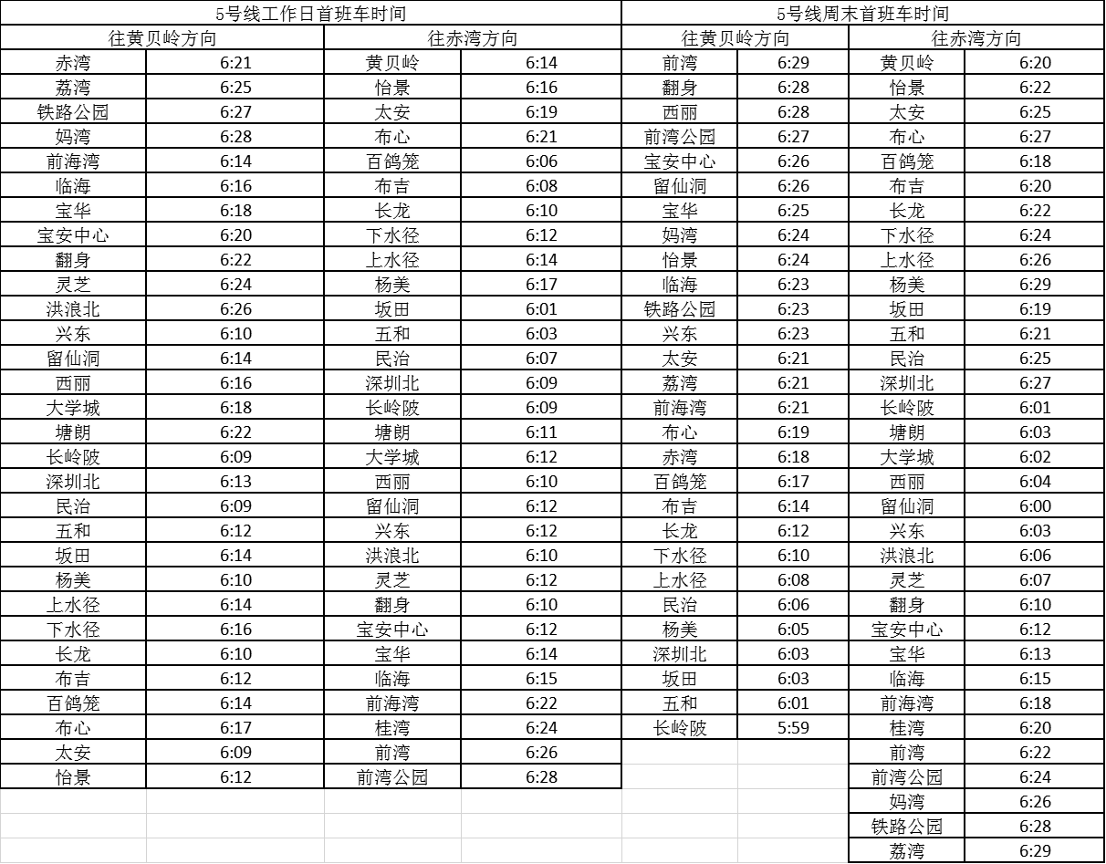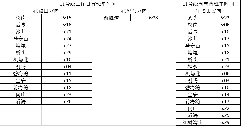 記者獲悉,經(jīng)優(yōu)化調(diào)整后,各線路工作日首班車最早發(fā)車站點(diǎn)及時(shí)間分別為,1號(hào)線老街站6:29、2號(hào)線蛇口港站6:14、3號(hào)線塘坑站6:05、5號(hào)線坂田站6:01、7號(hào)線赤尾6:09、9號(hào)線銀湖6:05、11號(hào)線機(jī)場站6:04。周末期間首班車最早發(fā)車站點(diǎn)及時(shí)間分別為,2號(hào)線香梅北站6:07、3號(hào)線塘坑站6:04、5號(hào)線長嶺陂站6:00、7號(hào)線皇崗口岸站6:09、9號(hào)線孖嶺站6:05、11號(hào)線機(jī)場站6:03。