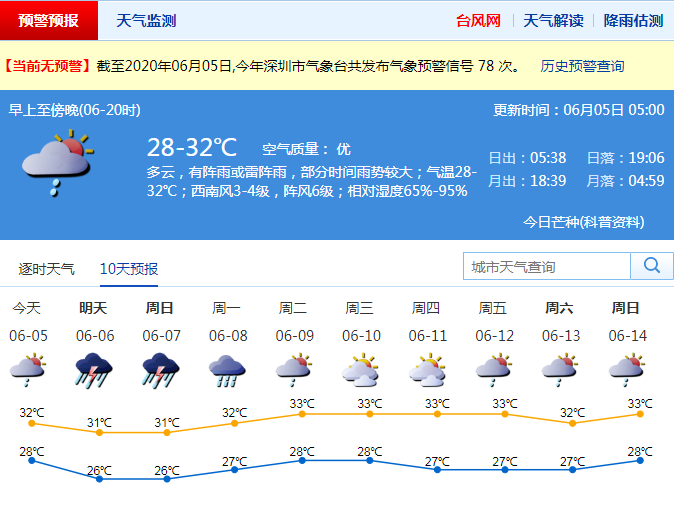 市氣象臺(tái)綜合預(yù)測(cè),深圳5日有陣雨或雷陣雨,部分時(shí)間雨勢(shì)較大;6日~8日有一次暴雨,局部大暴雨降雨過(guò)程,并伴有雷暴和8級(jí)左右短時(shí)大風(fēng);強(qiáng)降雨主要出現(xiàn)在6日凌晨至上午和7日凌晨至上午;8日午后降雨減弱。此外,降雨具有突發(fā)性明顯、短時(shí)雨強(qiáng)、累計(jì)雨量大的特點(diǎn),強(qiáng)降雨易出現(xiàn)在凌晨至上午。