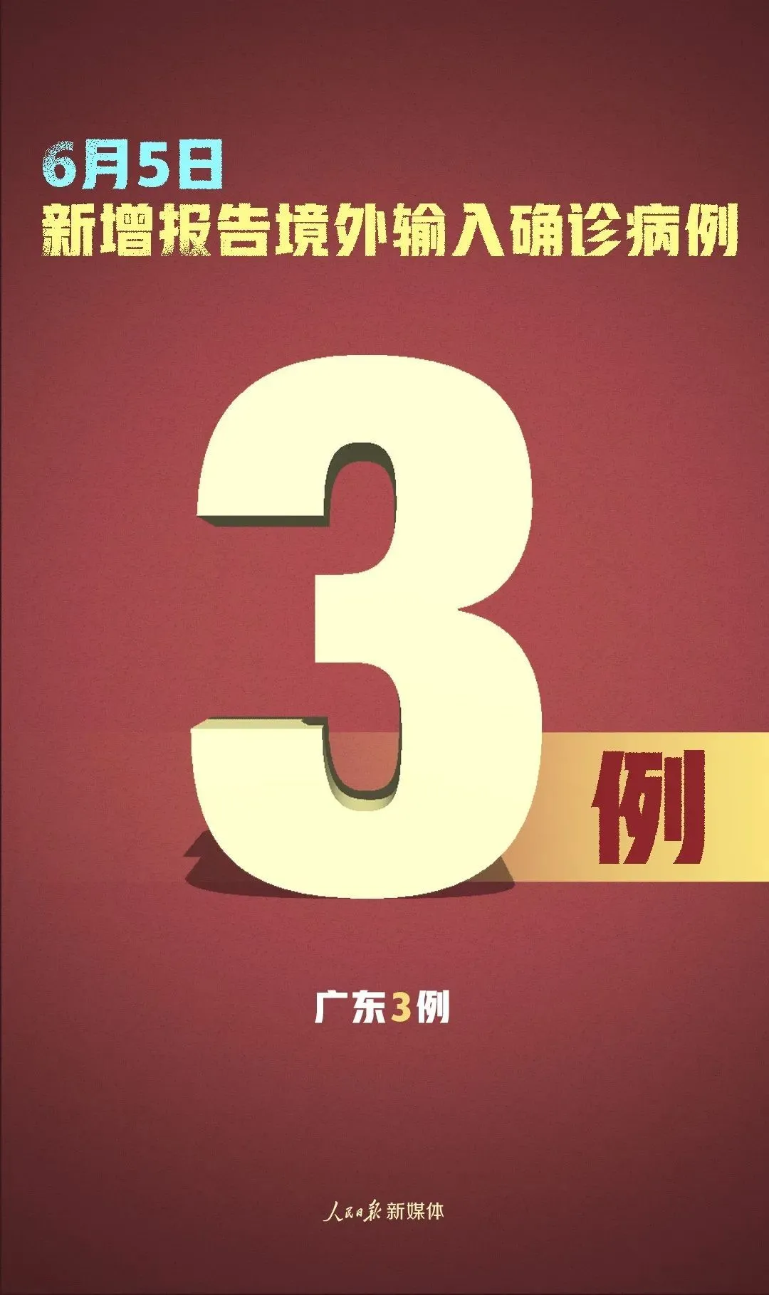 6月5日0-24時(shí),31個(gè)?。ㄗ灾螀^(qū)、直轄市)和新疆生產(chǎn)建設(shè)兵團(tuán)報(bào)告新增確診病例3例,均為境外輸入病例(廣東3例);無(wú)新增死亡病例;新增疑似病例1例,為境外輸入病例(上海1例)。
