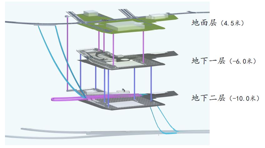 建議地下一層作為人行層和與地鐵銜接的交通樞紐層,地下二層作為主要交通層;在地下二層設(shè)置交通環(huán)島,實(shí)現(xiàn)地下空間與望海路地下快速路連接。