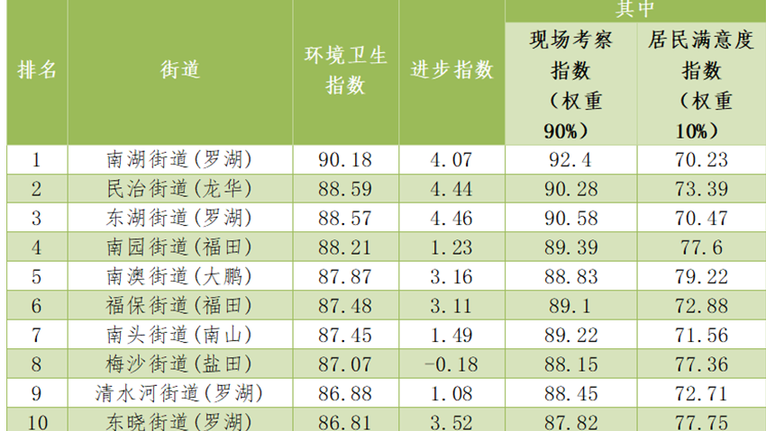 各街道環(huán)境衛(wèi)生進(jìn)步指數(shù)得分排名第1名的是福田街道(福田),第2名是黃貝街道(羅湖),第3名是東湖街道(羅湖),第4名是翠竹街道(羅湖),第5名是民治街道(龍華)。