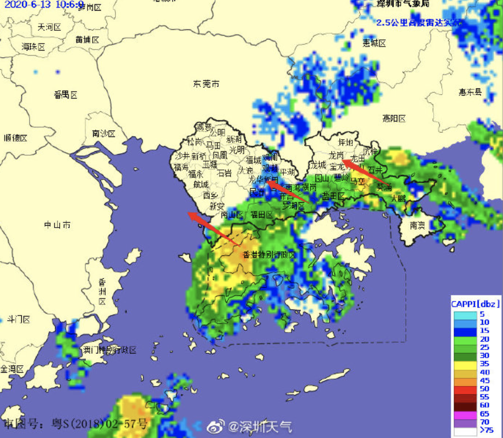 降雨云團(tuán)正在往西北方向移動,預(yù)計將會影響龍華、光明和寶安北部區(qū)域。