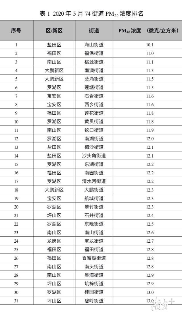 深圳74街道5月PM2.5濃度排名出爐,這些街道名列前十!