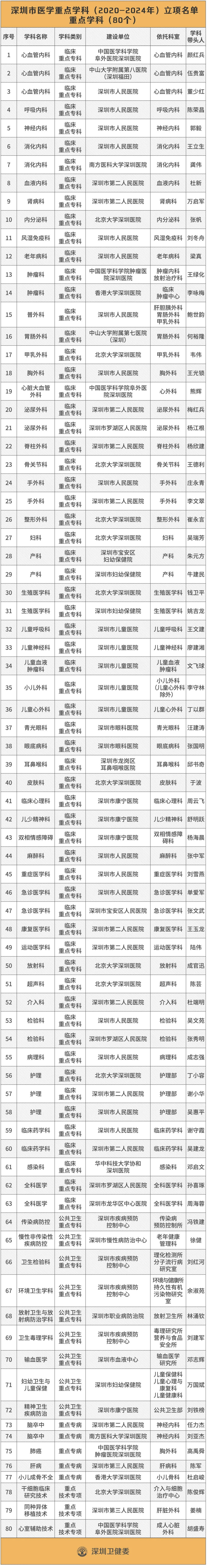 6月19日,深圳市衛(wèi)健委公布了2020-2024年的深圳市醫(yī)學重點學科立項名單,包括80個重點學科、15個重點培育學科。此外,深圳還有24個??迫脒x“省重點”名單,其中13個是國家衛(wèi)健委或國家中醫(yī)藥管理局認定的國家級臨床重點專科。這份名單是2019年由廣東省衛(wèi)健委公布的“廣東省高水平臨床重點??啤泵麊?。