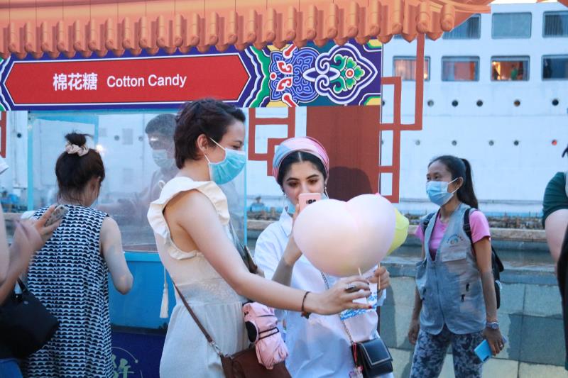 記者在現(xiàn)場看到,現(xiàn)場設置了糖畫、剪影、捏面人、皮影戲等中國傳統(tǒng)民俗攤位,不少居民有序排隊參與?;顒又?居民領取圖鑒在每個攤位完成打卡,還可以現(xiàn)場試穿漢服。場外的大唐不倒翁表演也吸引了眾人目光。精心打扮的不倒翁小姐姐隨風搖曳,與圍觀群眾打招呼,場面好不熱鬧。民樂團現(xiàn)場演奏的《春江花月夜》《彩云追月》等民樂,更令活動增添幾分傳統(tǒng)風韻。