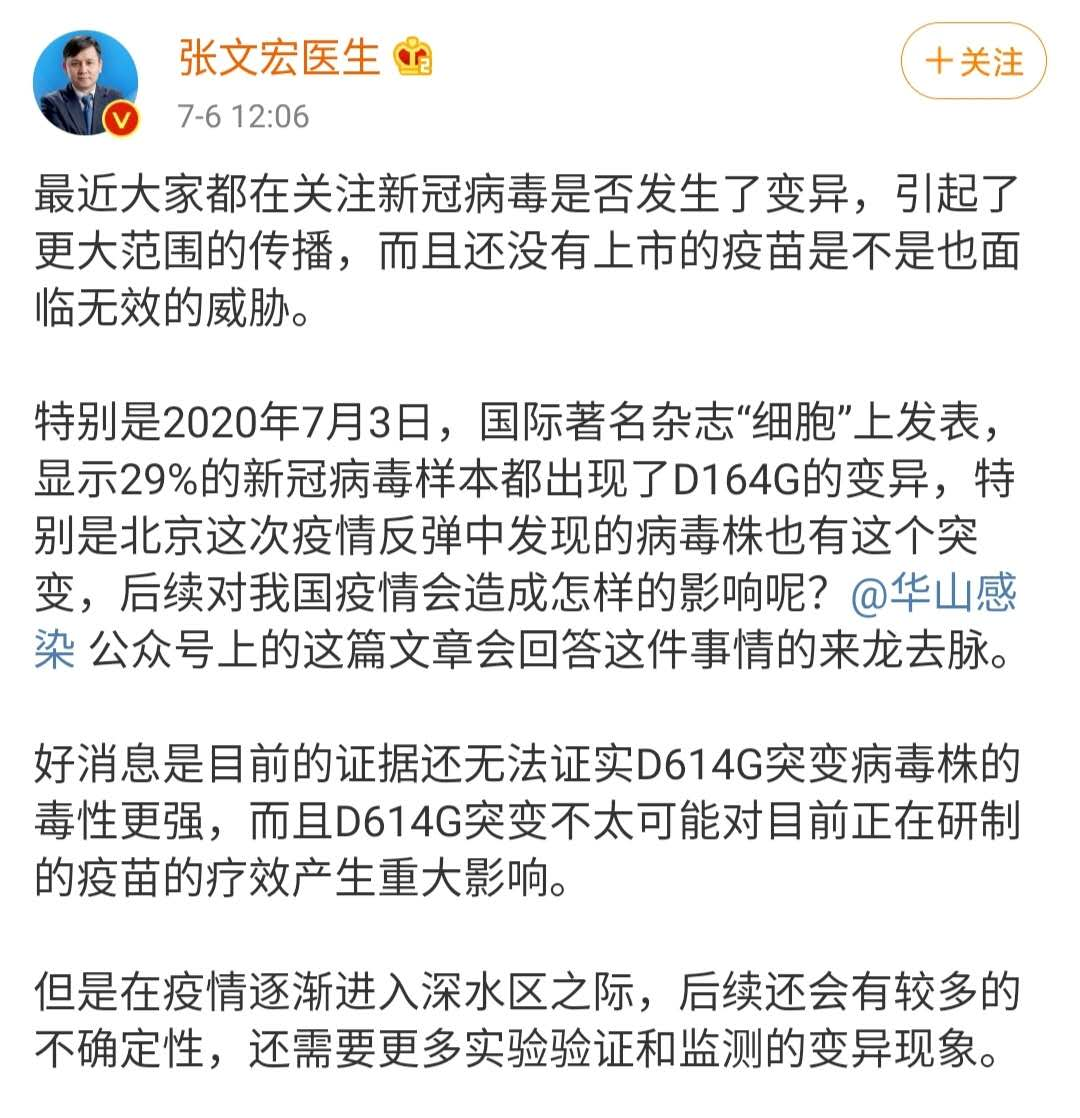 7月6日,上海復(fù)旦大學(xué)附屬華山醫(yī)院感染科主任張文宏通過(guò)微博談“29%新冠病毒樣本現(xiàn)D614G變異”一事。