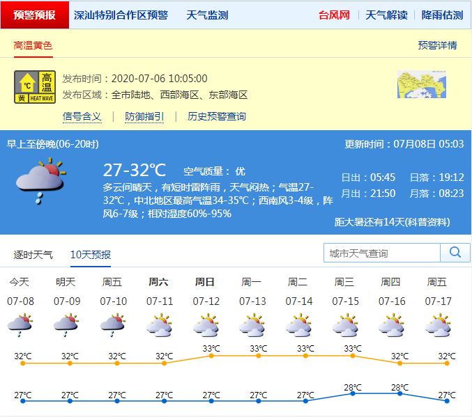 見圳客戶端·深圳新聞網(wǎng)2020年7月8日訊 據(jù)深圳市氣象臺預測,深圳今日多云間晴天,有短時雷陣雨,天氣悶熱;氣溫27-32℃,中北地區(qū)最高氣溫34-35℃;西南風3-4級,陣風6-7級;相對濕度60%-95%。