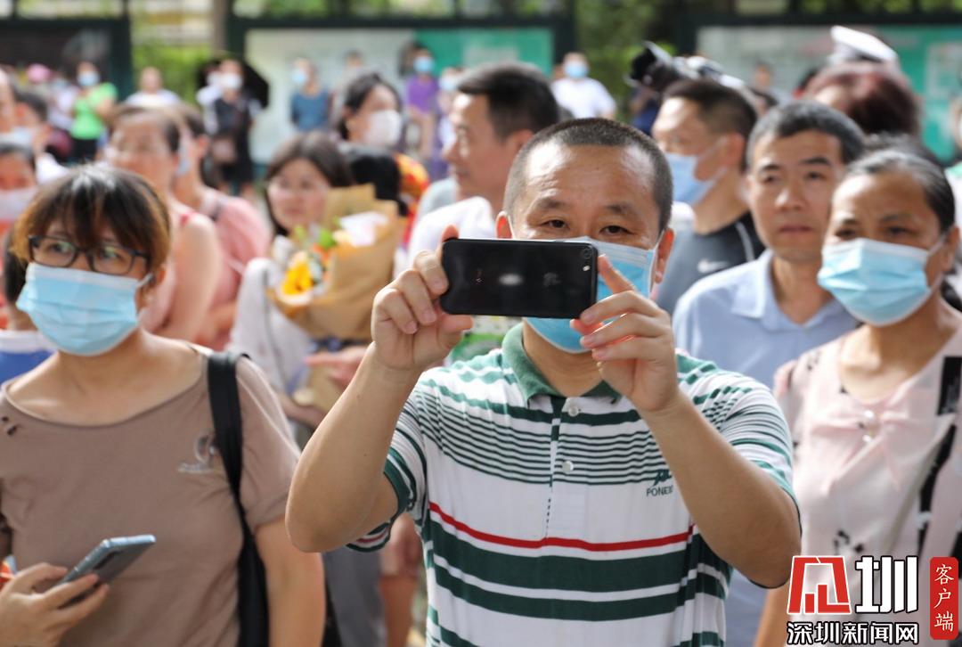 家長(zhǎng)舉起手機(jī),靜候于深圳高級(jí)中學(xué)考點(diǎn)門口。