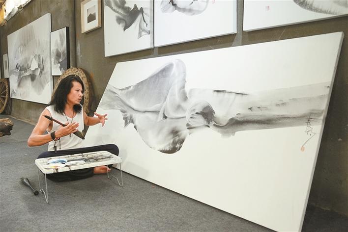 凌晨3點(diǎn),梧桐山腳下一間低矮樓房房頂?shù)漠?huà)室窗口亮起微弱的燭光。鄭泰均開(kāi)始烹茶研墨,茶香裊裊中,手中動(dòng)作不急不緩,任憑腦海中的靈感肆意飄散。不知不覺(jué)中,晨光從云層縫隙中泄下,山間的鳥(niǎo)鳴逐漸清晰,他走出畫(huà)室,在開(kāi)闊的天地之間開(kāi)始揮墨。