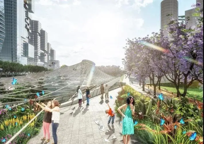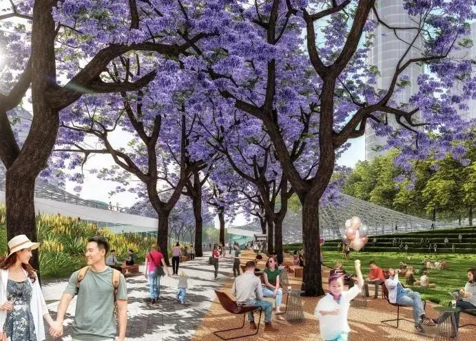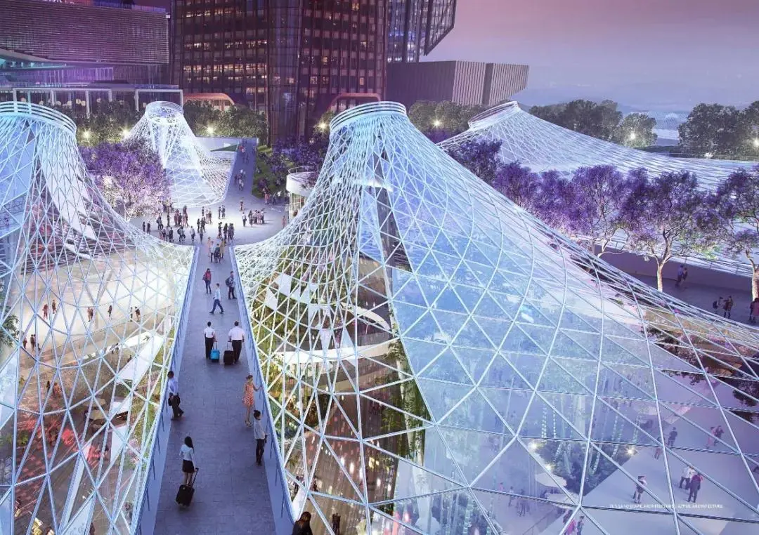 為車站廣場,“水晶山丘”屋面覆蓋著地下車站樞紐大廳,同時(shí)也在地面創(chuàng)造出造型獨(dú)特的城市地標(biāo)。光影和夜景效果與交叉的藍(lán)花楹大道配合,打造一個(gè)極具設(shè)計(jì)感的交通集散空間。地下共享大廳、地下森林與地面廣場、周邊建筑建立視覺聯(lián)系,成為中央綠軸美景的一部分。