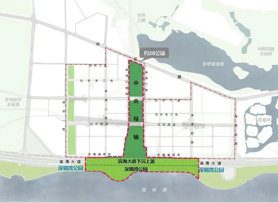 今年6月6日上午,該基地舉行中央綠軸項目開工活動,此次開工的中央綠軸項目南北全長約1.0公里,最大寬度達(dá)210米,是連接塘朗山——華僑城濕地——深圳灣“通山達(dá)?!钡暮诵目臻g軸線。隨著濱海大道深超總段下沉工程建設(shè),未來深超總紅線內(nèi)景觀將與深圳灣公園無縫銜接,共同構(gòu)成南北貫通的中央綠軸體系。