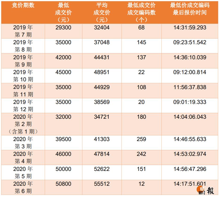 7月15日,2020年第7期普通小汽車增量指標競價公告發(fā)布,本期普通小汽車增量指標共3346個,其中個人指標2945個。競價時間定為7月27日9:00至15:00,連續(xù)進行6個小時,單位和個人在同一時間分別對相應增量指標進行競價。此前,第5期、第6期個人最低成交價均破5萬,創(chuàng)近一年新高。