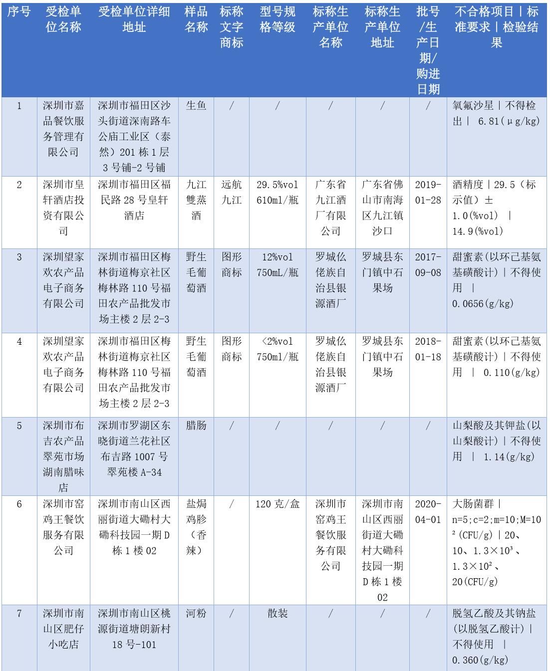 見圳客戶端·深圳新聞網(wǎng)2020年7月17日訊(晶報(bào)記者 鄧裴裴/制圖)7月17日,深圳市市場監(jiān)督管理局官網(wǎng)發(fā)布了2020年第二十二期食品安全抽樣檢驗(yàn)情況通報(bào),3-5月,共抽檢生產(chǎn)、流通、餐飲環(huán)節(jié)食品1229批次,發(fā)現(xiàn)不合格樣品47批次。記者注意到,不少不合格樣品抽檢單位為餐飲店,包括皇軒酒店、窯雞王、愛上牛蛙、御可奶茶等,還有些小吃店、腸粉店、螺獅粉店紛紛上榜。涉及不合格項(xiàng)目類別包括農(nóng)藥殘留、獸藥殘留、食品添加劑、微生物污染、品質(zhì)指標(biāo)、金屬等元素污染物。