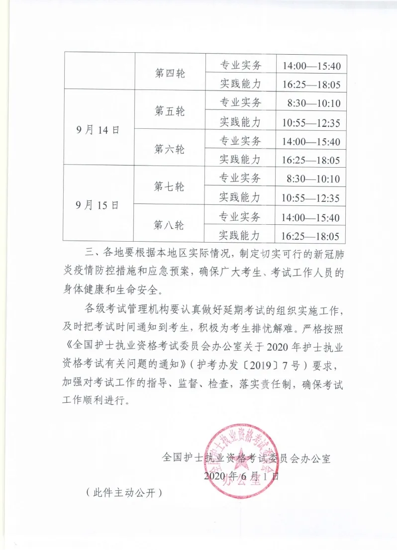 6月1日,全國護(hù)士執(zhí)業(yè)資格考試委員會(huì)辦公室印發(fā)《關(guān)于延期舉行2020年護(hù)士執(zhí)業(yè)資格考試的通知》,2020年護(hù)士執(zhí)業(yè)資格考試延期至9月12日—15日舉行。