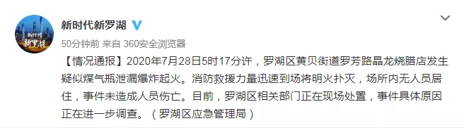 【情況通報(bào)】2020年7月28日5時(shí)17分許,羅湖區(qū)黃貝街道羅芳路晶龍燒臘店發(fā)生疑似煤氣瓶泄漏爆炸起火。消防救援力量迅速到場(chǎng)將明火撲滅,場(chǎng)所內(nèi)無(wú)人員居住,事件未造成人員傷亡。目前,羅湖區(qū)相關(guān)部門正在現(xiàn)場(chǎng)處置,事件具體原因正在進(jìn)一步調(diào)查。(羅湖區(qū)應(yīng)急管理局)