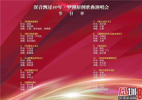 歌曲創(chuàng)作是深圳市羅湖區(qū)的強項,中國大陸的流行歌曲即由此發(fā)端。四十年來,《春天的故事》、《走進新時代》、《跟隨你的隊伍越走越長》、《山歌唱出好兆頭》等一大批膾炙人口的羅湖原創(chuàng)歌曲,經由影視、廣播等媒體傳播,風靡大江南北,反映了時代劇變,表達了人民心聲。此次演唱會,精選了其中的12首歌曲,由熊家源、余鳳蘭、劉小幻、范媛媛、楊樂、支慧、趙久峰、都園園、王景、徐余瀚韻等數(shù)位深圳歌唱家傾情演繹,其中既有創(chuàng)作于上世紀的歌曲,也有近年來新創(chuàng)作的歌曲,堪稱一場聲樂盛宴。